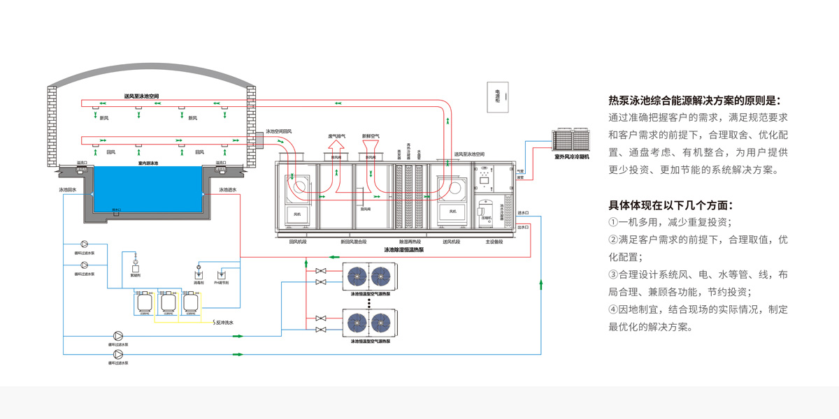 根據學校泳池具體情況,如尺寸大小、建筑結構、使用時間、熱水需求、空調需求等等,優(yōu)化方案,打造高能效系統(tǒng),減少能耗。